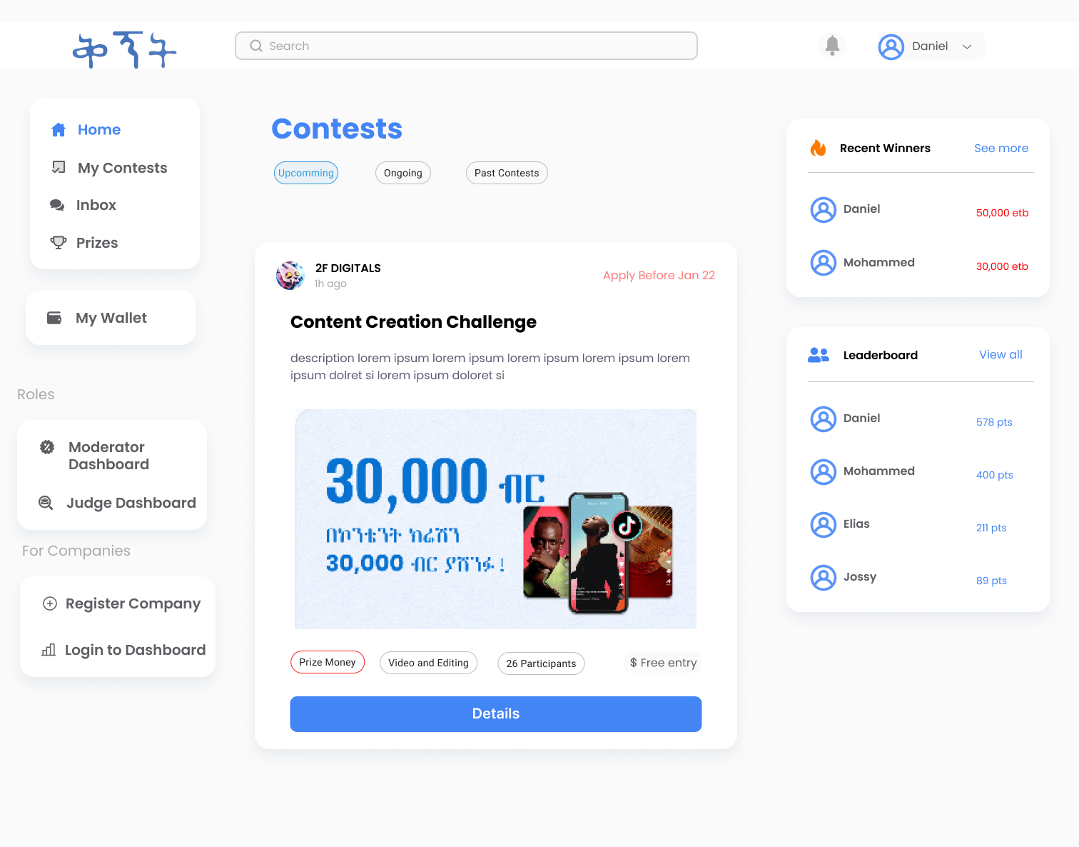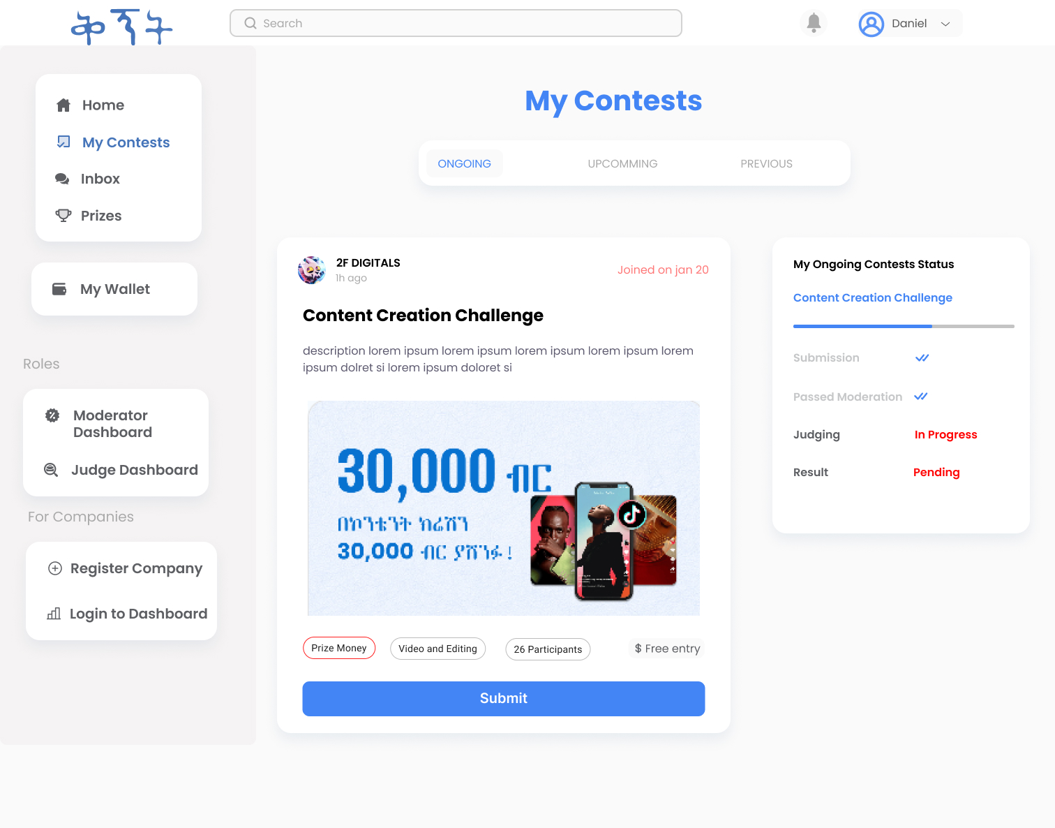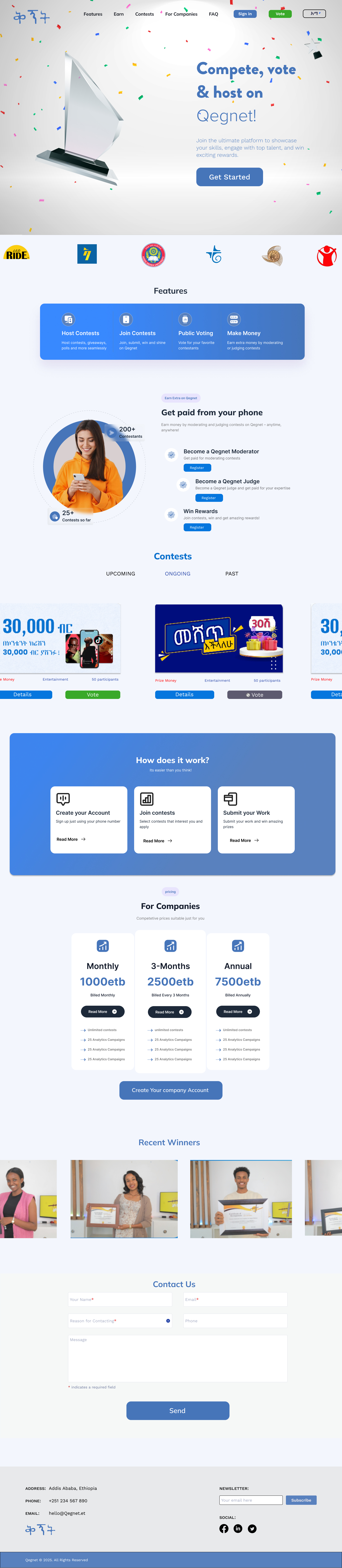 This project involved a complete UI/UX redesign of Qegnet.et, a competition hosting platform that allows users to participate in contests, submit entries, and receive scores from judges, while also enabling companies to host and manage competitions. My role focused on identifying and addressing critical usability shortcomings in the existing platform. Through in-depth UI/UX evaluation, I pinpointed pain points across user roles—participants, judges, admins, and contest hosts—and redesigned the interface to improve clarity, navigation, and overall user flow. The result is a cleaner, more intuitive experience that supports scalability and enhances engagement for all platform users.